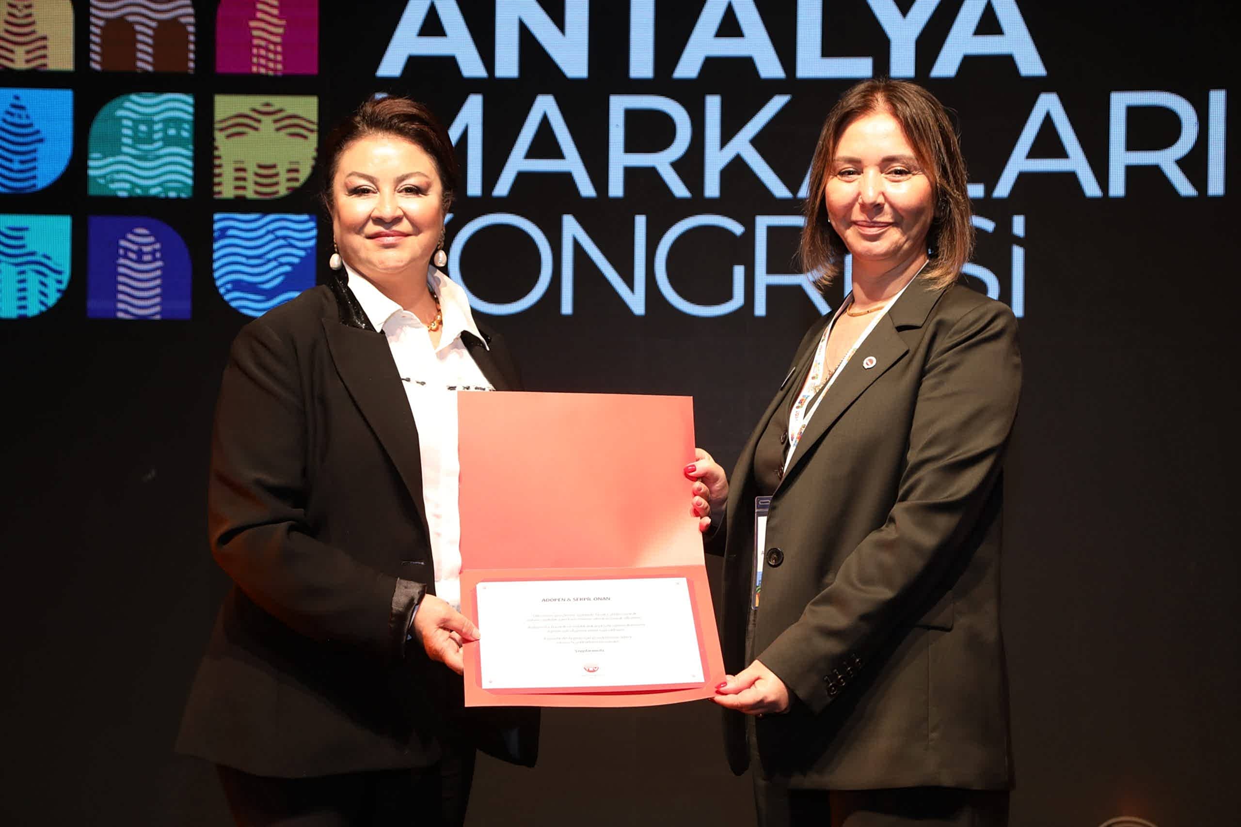 Antalya Markaları Kongresi’nde konuşan ADO Grup Yönetim Kurulu Üyesi Sn.Serpil Onan, hem şirketin kuruluşundan bu yana geçirdiği dönüşüm sürecini hem de kendi kariyer yolculuğunu anlattı. Adopen’in Antarktika hariç tüm dünyada faaliyet gösterdiğini belirten Onan, Mayıs’ta Mısır’da yeni fabrika açacaklarını, yıl sonuna kadar Brezilya’da üretime başlayacaklarını açıkladı. Konuşmasının ardından kendisine plaket takdim edildi.